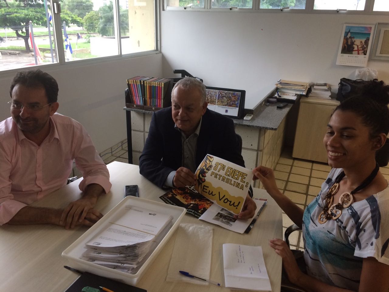 O Reitor da Universidade de Pernambuco (UPE), Prof. Pedro Henrique de Barros Falcão, em reunião com a CO na segunda-feira (29) em Recife/PE, declarou o apoio institucional, material e financeiro da instituição ao Encontro. Confirmando sua participação na abertura do ENEPe, o Reitor da UPE e o Diretor do Instituto de Apoio à UPE - IAUPE, Prof. Roberto Alves dos Santos, posaram para fotos com o cartaz "37º ENEPe - Petrolina: Eu vou!".