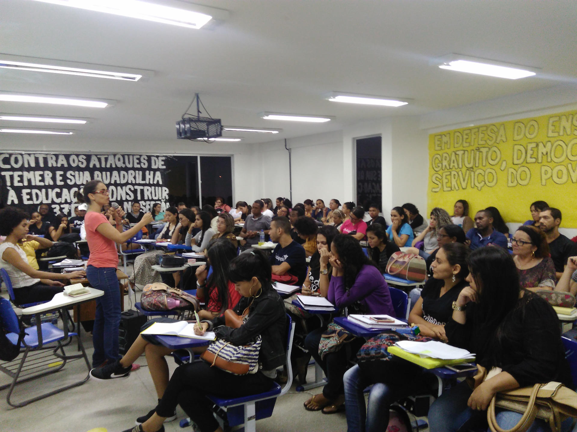 As palestras dos professores foram muito boas e, no total, mais de 170 estudantes puderam participar! Vários professores transferiram suas aulas para o pré-ENEPe, levando as turmas inteiras para a atividade. Foi um sucesso!! As discussões foram riquíssimas abordando a necessidade de lutar para revogar as medidas antidemocráticas do CNE/MEC, como as DCNs de 2006, a Reforma Curricular da Pedagogia de 2015 e a BNCC em implantação, bem como a indissociabilidade entre essas medidas e as contra-reformas trabalhista e previdenciária, sendo necessária uma luta para combater todas elas em conjunto. A professora Carolina e o professor Alexandre demonstraram claramente como essas medidas são imposições do imperialismo sobre nosso país e que contam com a participação ativa dos governos atual e anteriores para sua implementação, enquanto o professor José Flávio criticou veementemente os rumos que o currículo da pedagogia tem tomado e o efeito disso sobre a nossa formação.